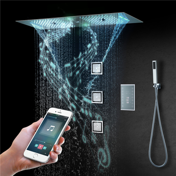 Müzik LED duş başlıkları SUS304 36*12 inç müzik hoparlörü yağmur biçimli duş tavana monte banyo duş sistemi