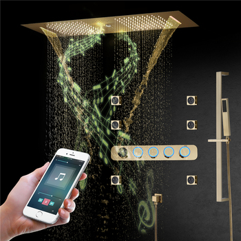 Fırçalanmış altın duş seti tavan 20 inç Led duş başlığı müzik sistemi ile termostatik kontrol ana gövde banyo duş musluk