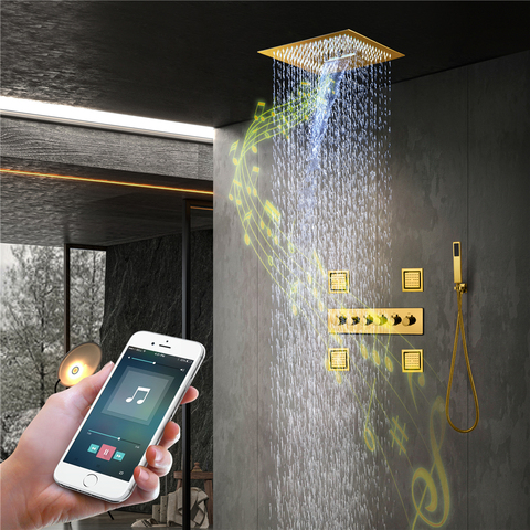 Водопад, Светодиодная насадка для душа, музыкальная система с золотой отделкой, керамический сердечник клапана, современный дизайн, термостатический смеситель для ванной комнаты